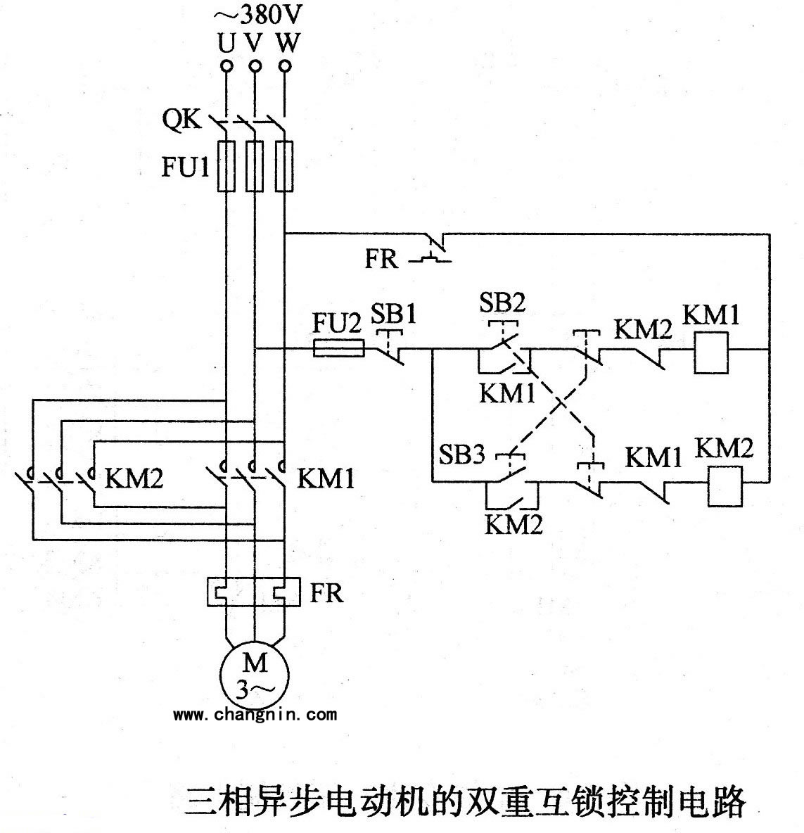三相異步電動(dòng)機(jī)的雙重互鎖控制電路的優(yōu)點(diǎn)是:如果要使正轉(zhuǎn)運(yùn)行的電動(dòng)機(jī)反轉(zhuǎn),不必先按停止按鈕SB1,只要直接按下反轉(zhuǎn)起動(dòng)按鈕SB3即可;當(dāng)然,從反轉(zhuǎn)運(yùn)行到正轉(zhuǎn),也是如此。這種電路具有電氣和機(jī)械的雙重“互鎖”功能,不但提高了控制的可靠性,而且既可實(shí)現(xiàn)正轉(zhuǎn)-停止-反轉(zhuǎn)-停止的控制,又可實(shí)現(xiàn)正轉(zhuǎn)-反轉(zhuǎn)-停止的控制